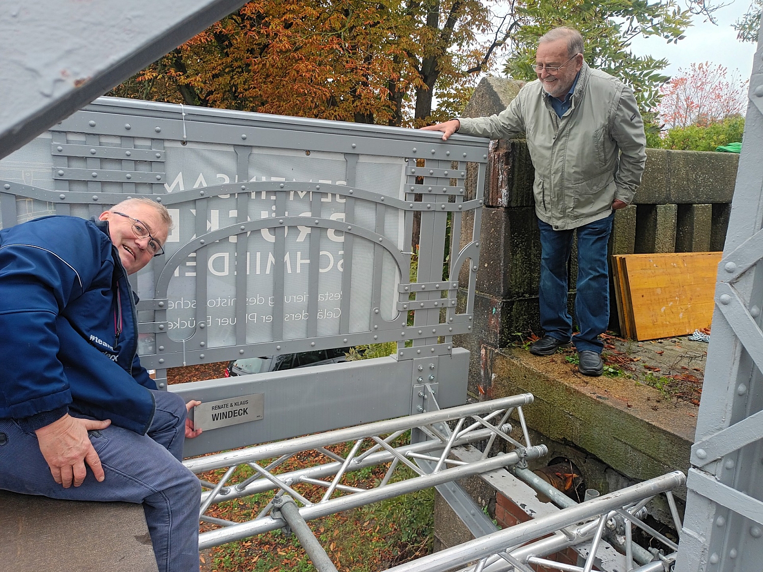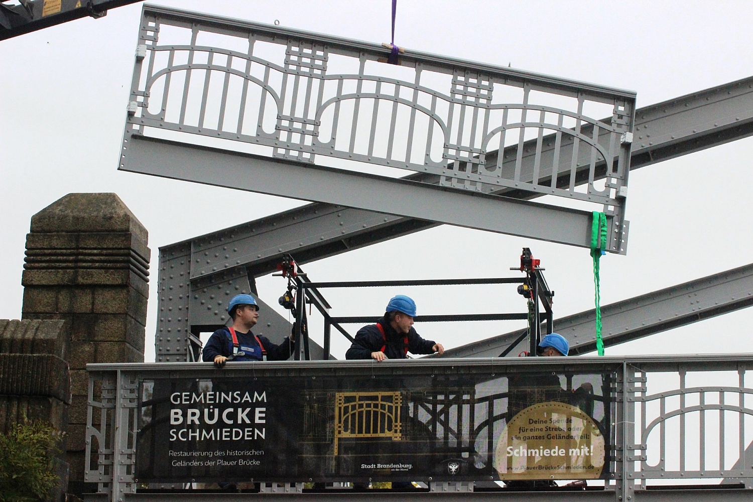 Heute und morgen werden die restaurierten Brücken-Geländer-Elemente fünf bis elf an der Plauer Brücke montiert. Damit reicht das Geländer auf der Schlossseite bereits über den ersten Brückenpfeiler hinaus. Ein Element kostet inklusive Montage gut 10.000 Euro. Sechs sind auch bereits bezahlt und beim siebten Element geht die Firma Windeck in Vorleistung. Die im Jahre 2017 ins Leben gerufene Bürgerinitiative „Alte Plauer Brücke“ richtete während des gesamten Tages unterhalb der Brücke ein kleines Fest aus. Am Nachmittag übergab der BI-Vorsitzende Hartmut Logemann dort einem Dutzend Spendern von der Designer-Firma Fisch und Blume entworfene Urkunden.