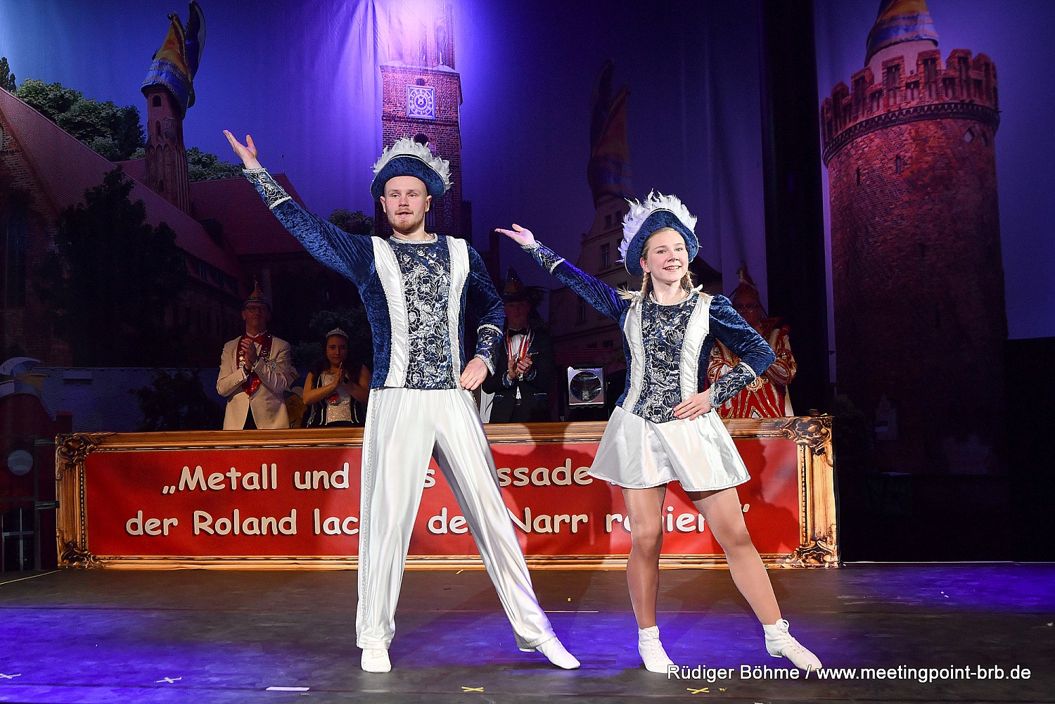 Ebenso herzlich begrüßt wurden die Vertreter des Karnevalverbandes Mark Brandenburg e.V. (KVMB), und des Karnevalsverbandes Berlin-Brandenburg (KVBB). Alle, bis auf die Gäste aus Kiel, hatten übrigens ihre Prinzenpaare mit dabei und sorgten so für einen besonders hoheitlichen Abend, der nicht nur bei der Eröffnung mit allen Paaren auf der Bühne zu sehen war.