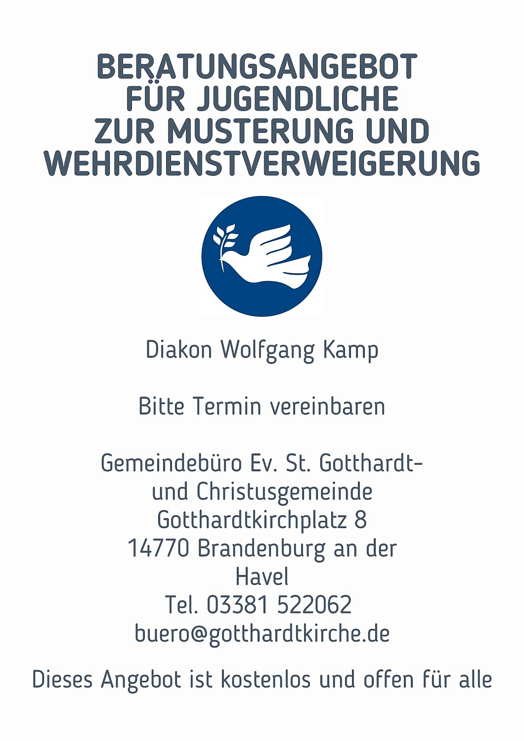 Das Grundrecht auf Kriegsdienstverweigerung aus Gewissensgründen ist im Grundgesetz verankert. Es gibt in der Stadt ein kirchliches Beratungsangebot für junge Menschen, die Fragen zur Musterung, Wehrpflicht und Wehrdienstverweigerung haben. Durch die aktuelle weltpolitische Situation und Entscheidungen in der Bundespolitik zur Wehrpflicht und Musterung ist dieses existentielle Thema für junge Menschen wieder in den Fokus gerückt.